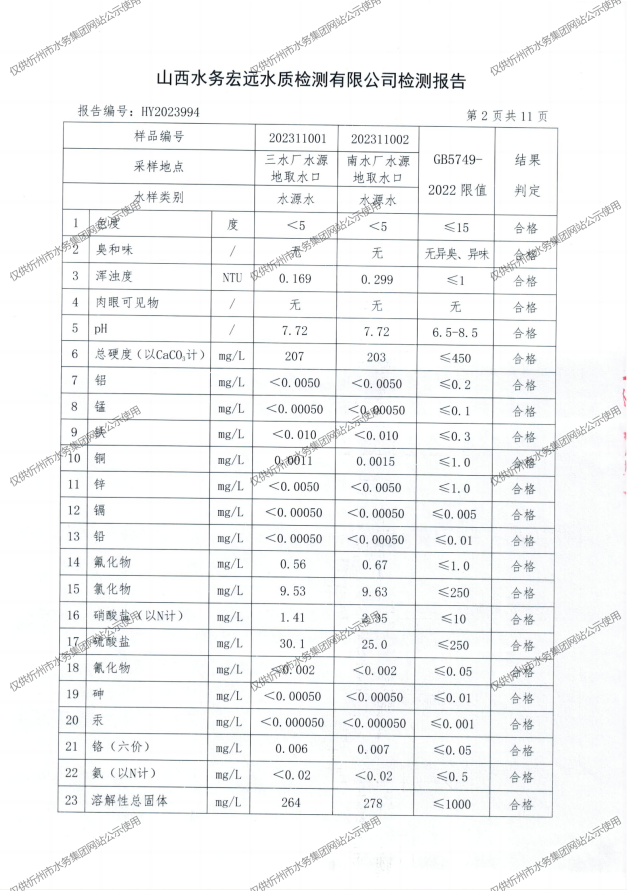 忻州城區(qū)公共供水水源水、出廠水、管網(wǎng)水、管網(wǎng)末梢水2023年11月份水質(zhì)信息公示